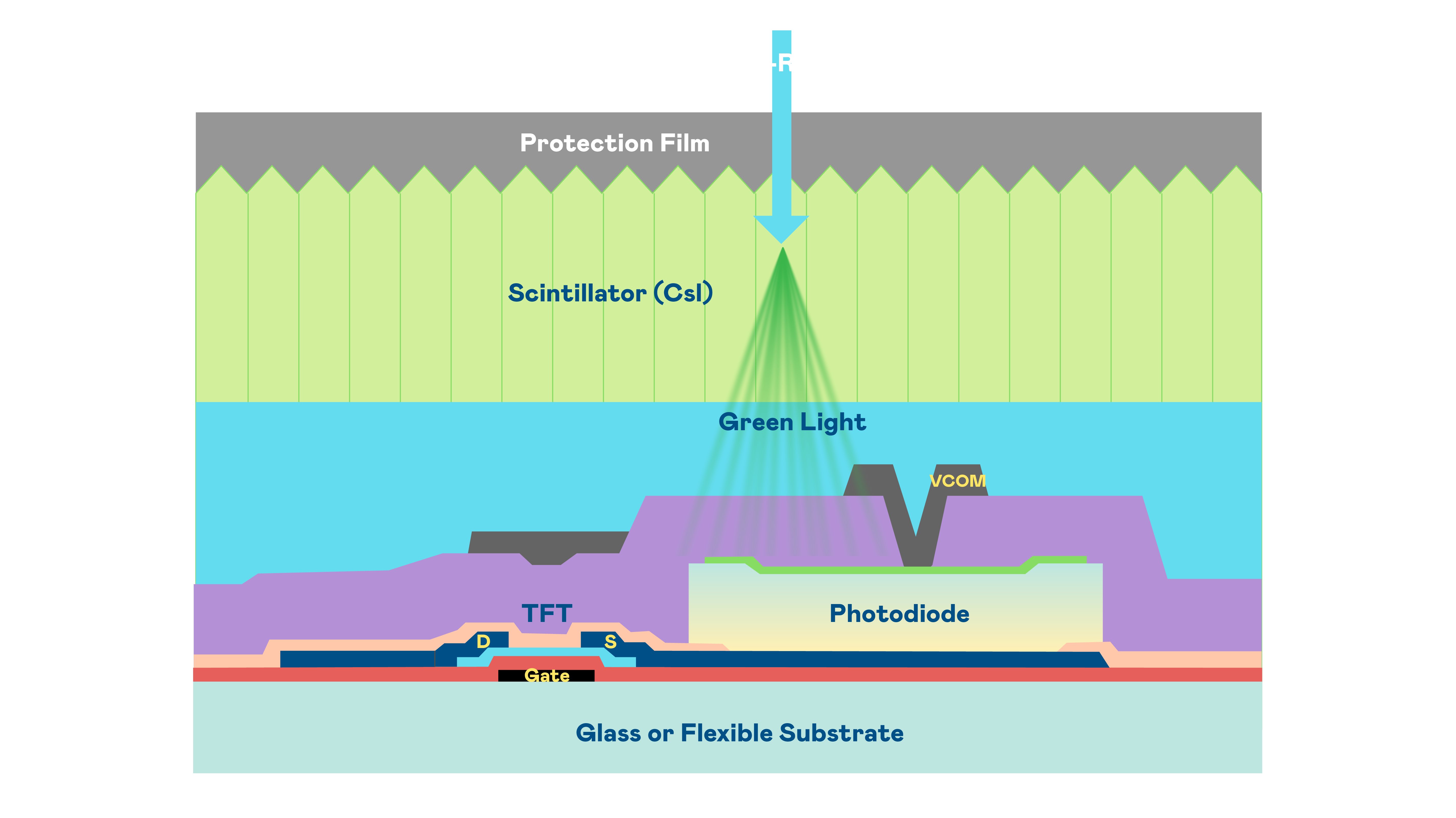 尊龙时凯人生就是搏官网的X光影像感測陣列使用薄膜電晶體 (TFT) 作為每個像素的讀取開關,搭配光電二極體(Photodiode)的光電轉換元件,用以感測X光影像訊號。